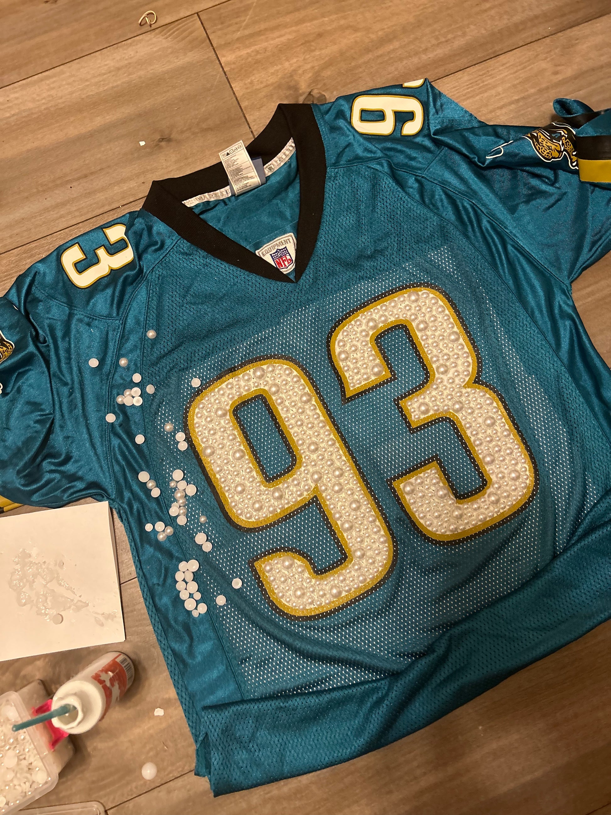 You MUST provide the jersey yourself. It is a minimum spend of $45 for the first hour and then $15 for every additional half hour. This is to provide fair pricing due to different color gems and different numbers taking more/less time. You will pay the 45 minimum now and be invoiced any additional fees once the product is finished. You must pay the invoice before picking up your Jersey!